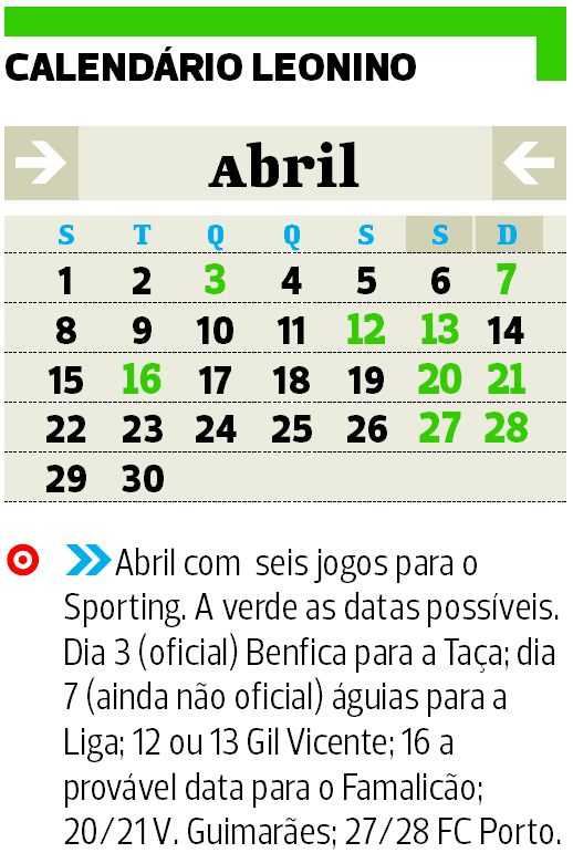 Hoje os leões jogam com o Boavista, última partida antes da paragem para as seleções. Voltam a competir a 30 de março, deslocação ao terreno do E. Amadora na jornada 27. Entra depois abril com a Taça de Portugal, 2.ª mão das meias com o Benfica, na Luz, jogando os leões vantagem de 2-1. Será o outro jogo a meio da semana (ver calendário em baixo). Além do Famalicão, há mais quatro encontros para a Liga: Benfica (dia 3 em Alvalade), Gil Vicente (12 ou 13 em Barcelos, uma sexta ou um sábado, porque na terça seguinte há o acerto de calendário), V. Guimarães (fim de semana de 20 e 21, Alvalade) e FC Porto no Dragão (27/28).