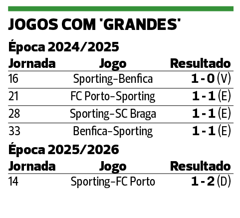 O percurso neste arranque de temporada não esconde essa fragilidade. Em 10 jogos oficiais, os leões somam três derrotas. Todas diante de adversários de igual valia: Benfica (0-1, Supertaça), FC Porto (1-2, Liga) e Nápoles (1-2, Champions). Três deslizes que beliscam, desta forma, um início positivo e prometedor. Uma lacuna que, de resto, é para ser reparada até porque, puxando a fita atrás, estende-se ao caminho percorrido por Rui Borges na época passada e que culminou com a conquista do título.