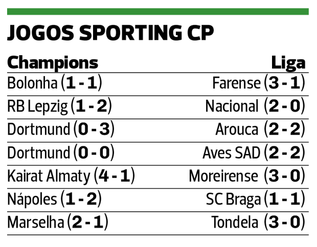 Essa ressaca italiana, de Nápoles, serve, assim, de bom exemplo para esta sequência, curiosamente também transalpina, da última partida em Turim, diante da Juventus. O saldo, para já, se tivermos em linha de conta os duelos com o Kairat Almaty e Marselha (seguiram-se duas vitórias convincentes com o Tondela e Moreirense, ambas por 3-0), mas na época passada, quando o Sporting ombreava com o Benfica na luta pelo título, houve mais dois desaires após partidas de Liga dos Campeões.