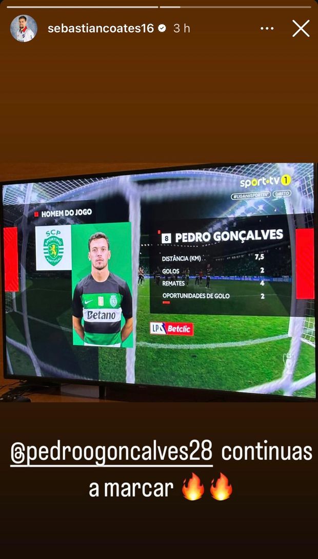 «Continuas a marcar», escreveu numa história na rede social Instagram, publicando ainda outra foto com sinal de força após a vitória por 3-1 em Alvalade.