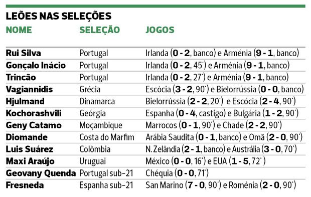 O capitão Hjulmand somou 110 minutos nas pernas ao serviço da Dinamarca (segue para o play-off de apuramento para o Mundial), seguindo-se Diomande (Costa do Marfim), Kochorashvili (Geórgia) e Vagiannidis (Grécia), com 90 minutos cada, Maxi Araújo no Uruguai (88’), Luis Suárez na Colômbia (70’), Quenda, nos sub-21 de Portugal (71’) e os lusos Gonçalo Inácio (45’) e Trincão (27’).