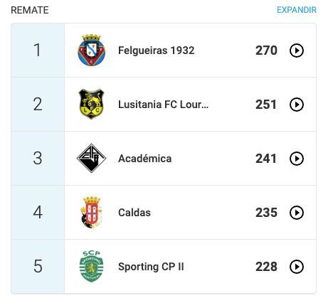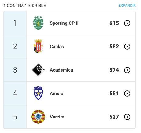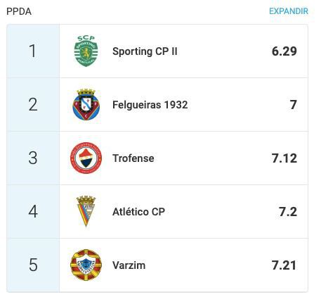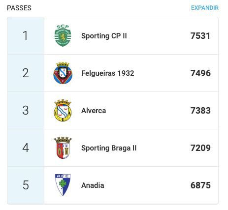 A BOLA teve acesso aos dados do Sporting B no Wyscout, plataforma de análise que mostra minuciosamente dados das equipas e os números traduzem que o índice de desempenho da cantera leonina domina praticamente todos os parâmetros. Vejamos: o Sporting lidera em passes de ação defensiva (6,29), posse de bola (59,7%), um contra um e drible (615), intensidade do desafio (7,3), passes (7531), corridas seguidas (315), idade mais baixa do plantel (19,1) e passes certo (86%), sendo que o registo em que os leões não estão no topo da tabela é no número de remates, com os leões a surgiram na 5.ª posição. Outro dado curioso, é o facto de os leões serem a segunda equipa que mais faltas sofre (290).