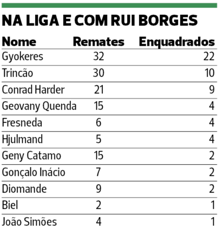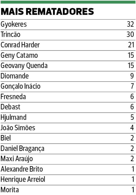 Gyokeres e Francisco Trincão foram os que mais remataram, respetivamente com 32 e 30 bolas na direção da baliza. O sueco apontou 9 golos nesses 32 remates. Precisa de pouco mais de três para fazer golo. O português apontou três golos, pelo que precisa de rematar muito mais para colocar a bola no fundo da baliza. Grosso modo, a cada dez remates o esquerdino faz golo. Gonçalo Inácio (7 remates, 2 golos) e Fresneda (6 remates, 2 golos) estão ao nível de Gyokeres na eficácia rematadora.