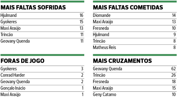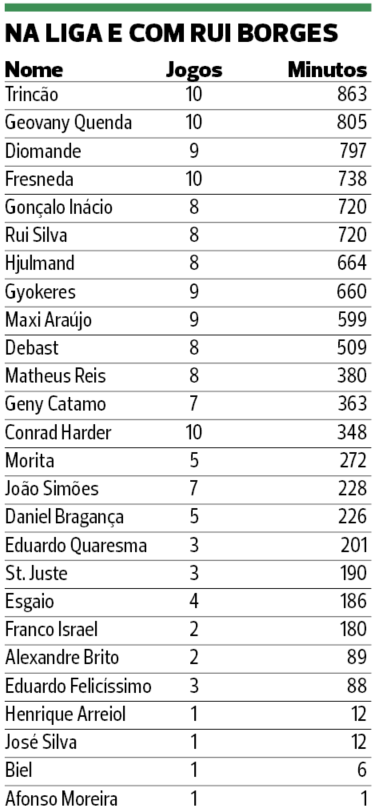 Depois, com utilização entre 50 e 90 por cento (450’ a 810’) e minutos, surgem nove nomes: Geovany Quenda, Diomande, Fresneda, Gonçalo Inácio, Rui Silva, Hjulmand, Gyokeres, Maxi Araújo e Debast.