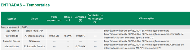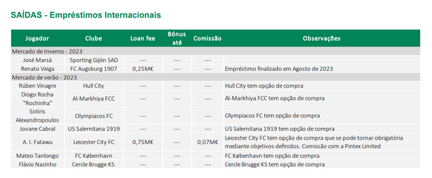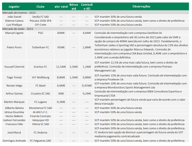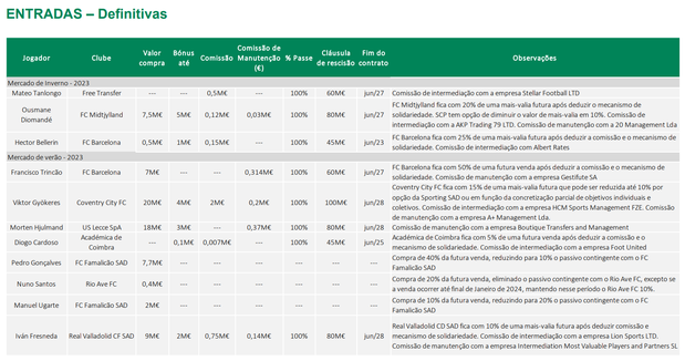 O Sporting divulgou, esta quarta-feira, o resumo das operações de entradas e saídas de jogadores ocorridas nos períodos de transferências de 2023, documento enviado à Comissão do Mercado de Valores Mobiliários (CMVM).