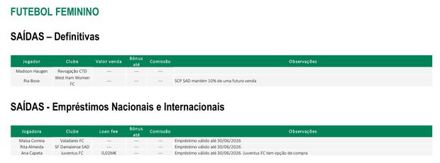 Também no feminino foi feito resumo dos negócios, destacando-se o facto de o Sporting ter recebido 20 mil euros pelo empréstimo de Ana Capeta à Juventus, com o emblema italiano a ter opção de compra após o empréstimo, que termina em junho.