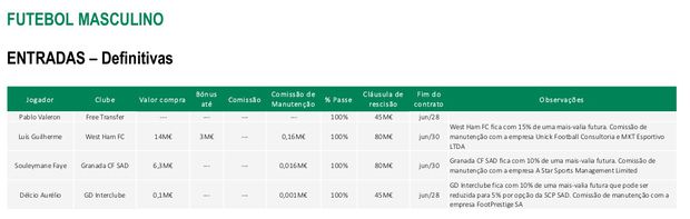 Quanto aos empréstimos internacionais, nomeadamente de Rodrigo Ribeiro (Augsburgo), Chris Grombahi (Club Brugge), Duarte Correia (Valladolid) e Alisson Santos (Nápoles), todos os clubes que os receberam têm opção de compra.