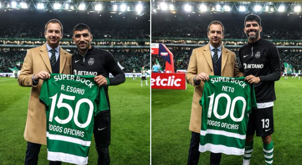 O presidente Frederico Varandas entregou camisolas alusivas aos 150 jogos de Ricardo Esgaio de leão ao peito e aos 100 de Neto.