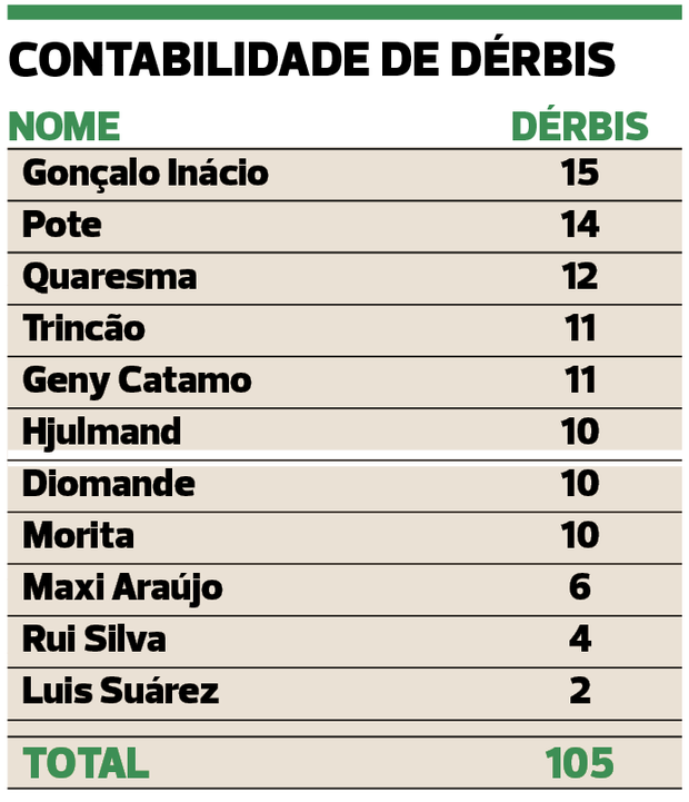 A contabilidade da maturidade leonina ultrapassará os três dígitos se Eduardo Quaresma, já um veterano nestas andanças com 12 dérbis, seja mesmo a aposta como tudo indica. Com Quaresma o número sobe aos 105 dérbis no total. Caso a aposta recaia em Fresneda (com 7 dérbis) o leão atinge o número redondo dos 100 jogos contra o rival encarnado.