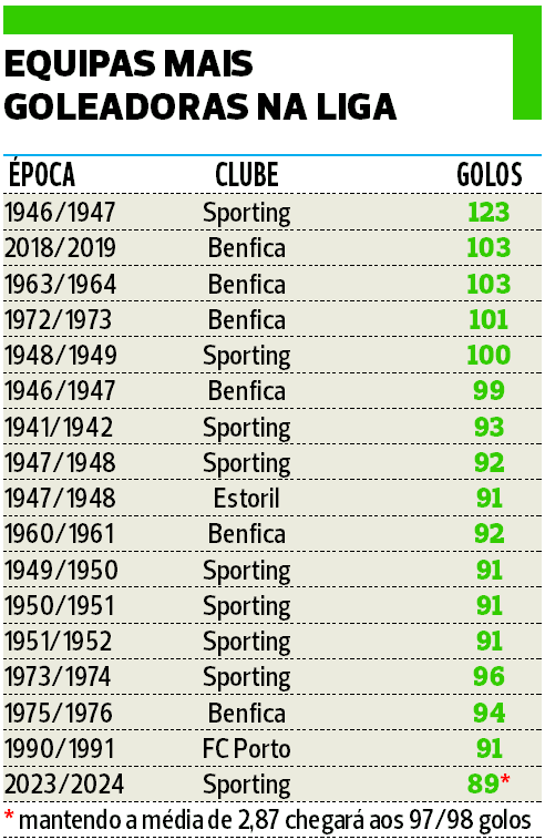 No topo deste ranking está outra equipa do Sporting, a que em 1946/1947 foi campeã nacional, comandada por Robert Kelly, e que terminou a temporada com 123 tentos. Na casa da centena, mais quatro - o Benfica de 2018/2019 (103), de 1963/1964 (103) e de 1972/1973 (101); o Sporting de 1948/1949 (100 sob o comando de Cândido de Oliveira), todas coroadas com o titulo.