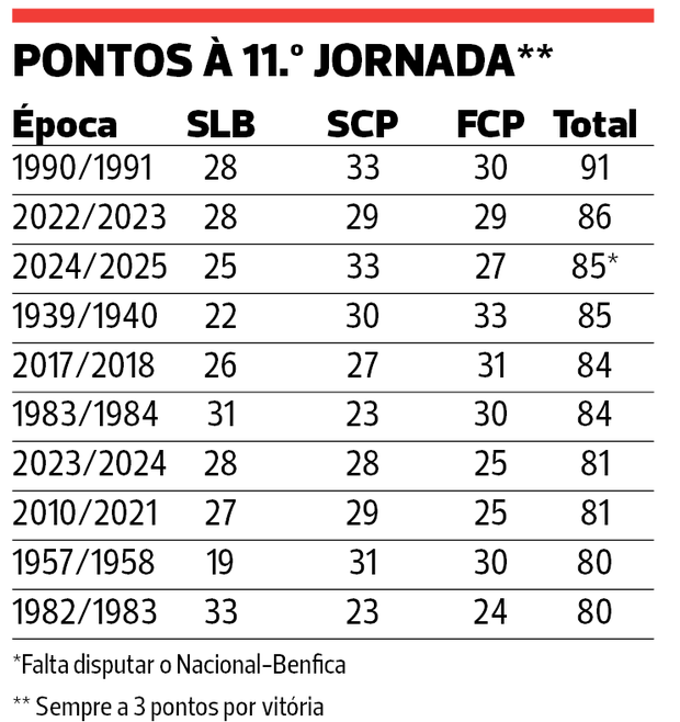 Há 34 anos, Sporting (33), FC Porto (30) e Benfica (28) somavam, em conjunto, 91 pontos. Agora, vão em 85. Há dois anos em 2022/2023, iam em 86 pontos. Se o Benfica ganhar na Madeira, na jornada em atraso, 2024/2025 ultrapassa 2022/2023 e fica a três de 1990/1991. Se empatar na Choupana, iguala 2022/2023.