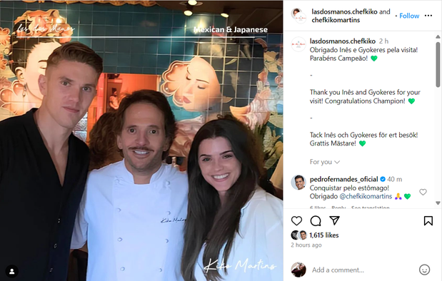 Um dos momentos mais esperados pelos adeptos do Sporting, que alimentam esperanças de ver o jogador permanecer de leão ao peito depois do final da época, viu a luz do dia através de uma publicação do chef Kiko, que agradeceu a presença de ambos no seu restaurante: «Obrigado Inês e Gyokeres pela visita. Parabéns campeão», referia a partilha, entretanto eliminada.