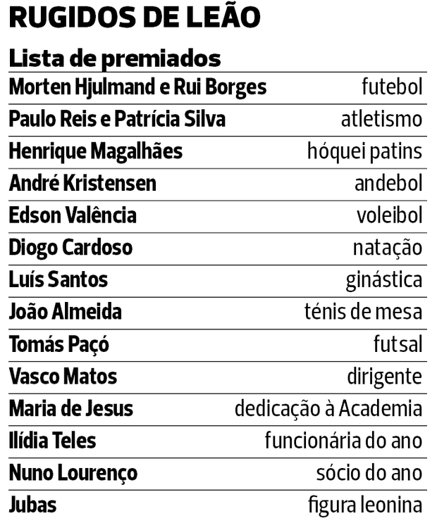 Entre os muitos momentos aguardados da noite estão os prémios dedicados ao futebol, no qual se destacam Morten Hjulmand (não estará presente pois está ao serviço da seleção da Dinamarca) e o treinador Rui Borges (presença confirmada). Seguir-se-á, depois, a entrega de prémios a muitas outras personalidades que se notabilizaram nas modalidades (ver quadro ao lado), mas também em termos coletivos como a homenagem preparada à equipa de hóquei patins que receberá as faixas de campeões do mundo, um dos feitos históricos da última temporada do clube leonino.