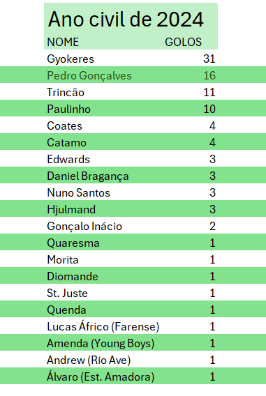 Mais 16 jogadores marcaram golos pelos leões em 2024, sendo quatro na própria baliza a favor da equipa de Rúben Amorim: Lucas Áfrico (Farense), Amenda (Young Boys), Andrew (Rio Ave) e Álvaro (Estrela da Amadora).