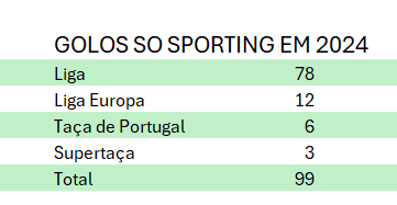 O Sporting pode chegar este sábado, frente ao FC Porto, ao 100.º golo no ano civil de 2024. Até agora, em 33 jogos oficiais (29 de janeiro a maio e 4 em agosto), os leões de Rúben Amorim marcaram 99 golos: 78 na Liga, 12 na Liga Europa, 6 na Taça de Portugal e 3 na Supertaça Cândido de Oliveira. A média de golos, claro, é absurda: três por jogo.