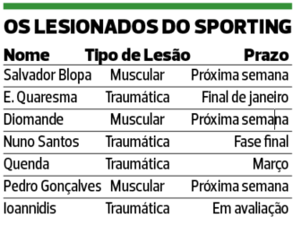 Ou seja, neste momento, entre regressos e novo lesionado, são sete os indisponíveis devido a problemas físicos: Salvador Blopa, Eduardo Quaresma, Diomande, Nuno Santos, Geovany Quenda, Pedro Gonçalves e Ioannidis.