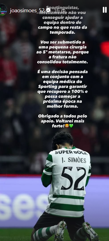 O cenário foi adiantado por A BOLA logo na manhã desta segunda-feira e foi há momentos confirmado por João Simões através duma story na rede social Instagram: não vai jogar mais esta temporada devido a um problema no quinto metatarso do pé direito. «Sportinguistas, infelizmente não vou conseguir ajudar a equipa dentro de campo no resto da temporada. Vou ser submetido a uma pequena cirurgia ao quinto metatarso porque a fratura não consolidou totalmente. É uma decisão tomada em conjunto com a equipa médica do Sporting para garantir que recupero a 100 por cento e possa começar a próxima época na melhor forma. Obrigado a todos pelo apoio. Voltarei mais forte», garantiu.