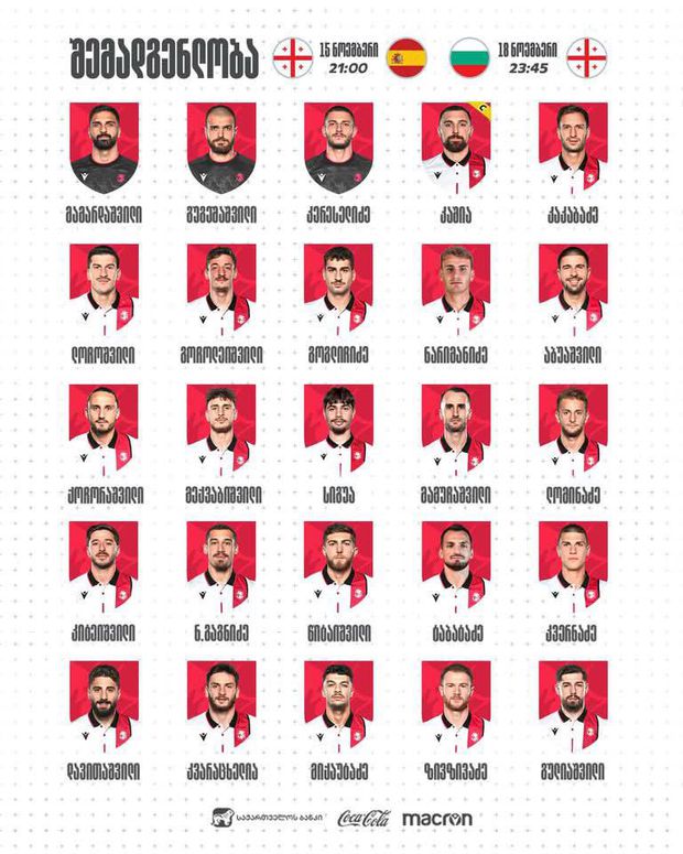 Willy Sagnol, selecionador da Geórgia, chamou 25 jogadores para os jogos com Espanha (dia 15) e Bulgária (a 18), tendo em vista o apuramento para o Mundial 2026, com Kochorashvili, médio do Sporting, a integrar a lista, assim como Nodar Lominadze, médio do Estoril.