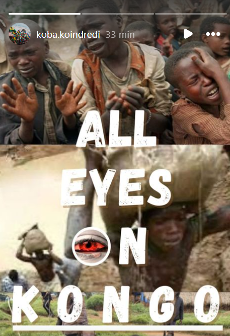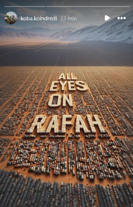 Através das redes sociais, Koba Koindredi associou-se ao movimento 'All eyes on Rafah' (todos os olhos em Rafah), cuja frase está a ser amplamente replicada, em sinal de apoio e solidariedade a quem reside na cidade de Rafa, localizada em Gaza, devastada pela guerra.