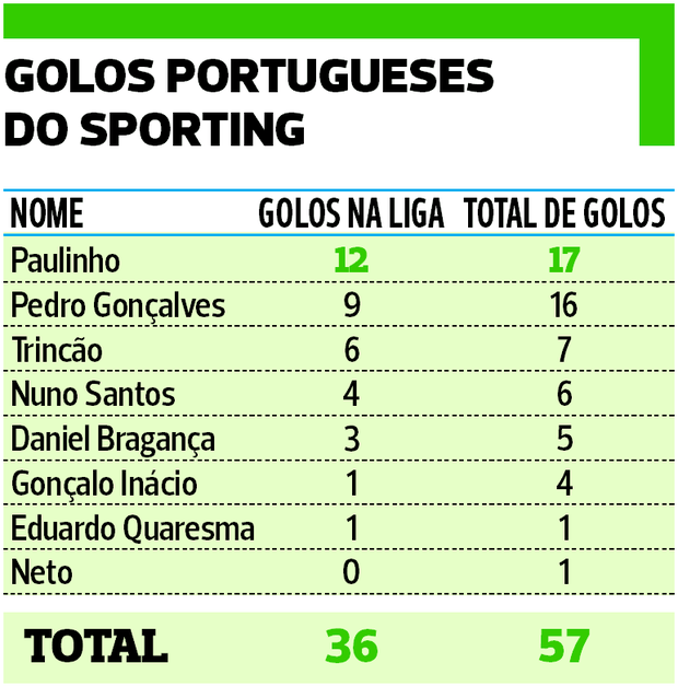 Como referimos, são 57 os golos portugueses obtidos pela equipa de Rúben Amorim na presente temporada, 36 dos quais no campeonato.