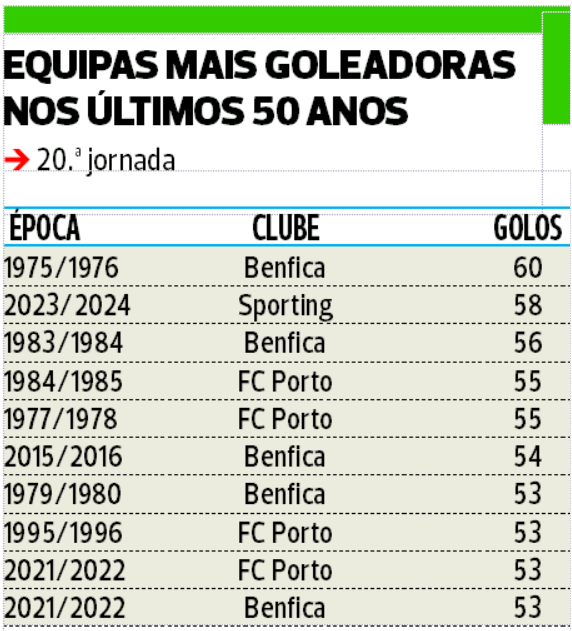 O campeonato já vai na 21.ª jornada, mas os leões têm apenas 20 jogos, devido ao adiamento do jogo com o Famalicão. À 20.ª jornada, só uma equipa conseguiu um registo melhor, nos últimos 50 anos, que o Sporting de Rúben Amorim: foi o Benfica de Mário Wilson, em 1975/1976, que levava 60 golos na mesma fase da prova. E acabaria por tornar-se campeão. Rui Jordão, na época em que trocou os encarnados pelo Saragoça, foi o melhor marcador com 30 tentos e em segundo lugar apareceu Nené, também do Benfica, com 29.