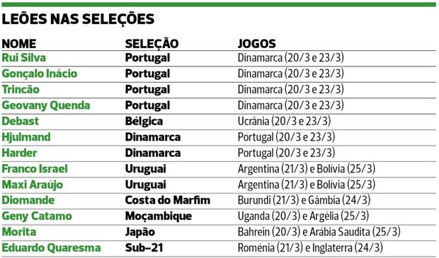Os compromissos das seleções nacionais arrancam esta quinta-feira para uma boa parte dos futebolistas do plantel principal do Sporting que estão ao serviço dos conjuntos dos seus países. Contas feitas, são nove os jogadores que podem entrar em ação.