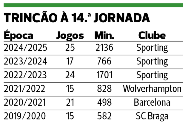E não fossem os golos e a influência de Gyokeres no atual modelo leonino, seria Trincão, por certo, a estrela maior deste Sporting. Com um rendimento e uma preponderância na equipa que o coloca, nesta fase da época (em dezembro na 14.ª jornada da Liga) como o jogador mais utilizado do plantel: 25 jogos somados, impressionantes 2136 minutos. A bater, de forma clara, todos os registos anteriores da carreira. Pelo menos neste primeiro terço de temporada.