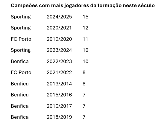 Agora, quatro anos após o primeiro campeonato ganho com a impressão digital de Ruben Amorim, o Sporting bate o recorde do FC Porto. Os três treinadores de 2024/2025 (Amorim, Pereira e Borges) utilizaram nada menos de 15 jogadores formados em Alcochete: Geovany Quenda, Gonçalo Inácio, Eduardo Quaresma, Daniel Bragança, João Simões, Ricardo Esgaio, Eduardo Felicíssimo, Alexandre Brito, Mateus Fernandes, Henrique Arreiol, Dario Essugo, José Silva, Mauro Couto, Rodrigo Ribeiro e Afonso Moreira. David Moreira, utilizado na final da Taça de Portugal, não tem qualquer minuto na Liga.