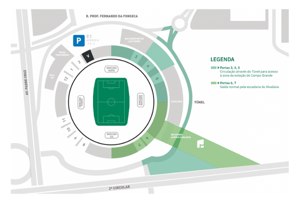 Para minimizar os efeitos deste contratempo, o clube de Alvalade aconselha os simpatizantes que entram pelas portas 3, 4 e 5 a que, no final do jogo, saiam pela esquerda em direção ao Multidesportivo/Rotunda do Leão para evitarem grandes concentrações junto ao Alvaláxia e, desse modo, acelerarem o processo de saída (ver imagem abaixo).