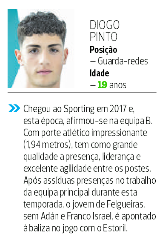 «O Diogo Pinto tem mais traquejo para ir para o banco», disse Amorim, aquando da lesão do espanhol Adán. Agora, o jovem tem de mostrar esse traquejo para assumir a titularidade do já campeão nacional, condição que lhe pode ser favorável na gestão da responsabilidade.