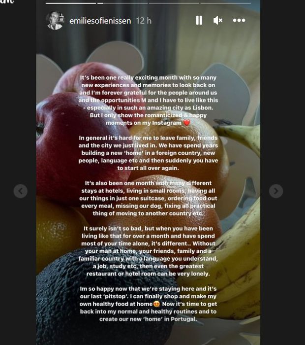 «Foi um mês excitante com tantas experiências e memórias que estou grata para sempre às pessoas à nossa volta, nesta cidade incrível que é Lisboa. É difícil deixar a família e os amigos e recomeçar tudo de novo. É diferente quando passas quase todo o tempo sozinha e num país em que não percebes o idioma. Até o melhor restaurante ou quarto de hotel pode ser solitário. Agora é altura de criar a nossa casa em Portugal», escreveu Sofie numa mensagem nos stories do Instagram.