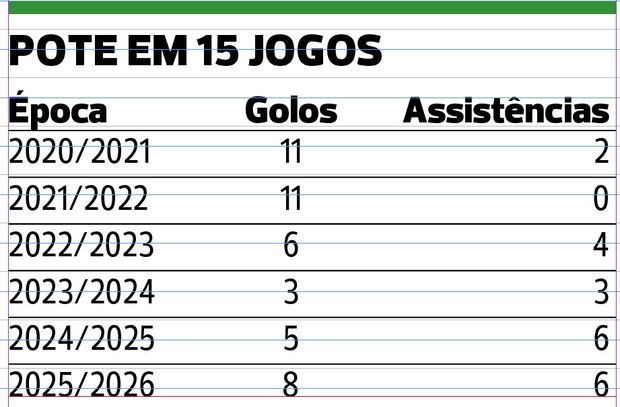 E à sexta época de leão ao peito, aos 27 anos, o camisola 8 está a render como nunca em prol da equipa. Com 15 jogos oficiais já cumpridos esta temporada, o extremo já leva 14 contribuições para golo — o que se traduz numa média de 0,93 de intervenção direta por jogo —, marcou oito e deu seis a marcar, assumindo, a par do colombiano Luis Suárez — que chegou a Alvalade com o rótulo de substituto de Gyokeres e é o jogador mais caro da história dos leões (€22,157 milhões mais €5,263 milhões em objetivos) , é o melhor marcados dos leões, seguidos por Trincão (cinco), Fotis Ioannidis e Quenda (ambos com quatro).