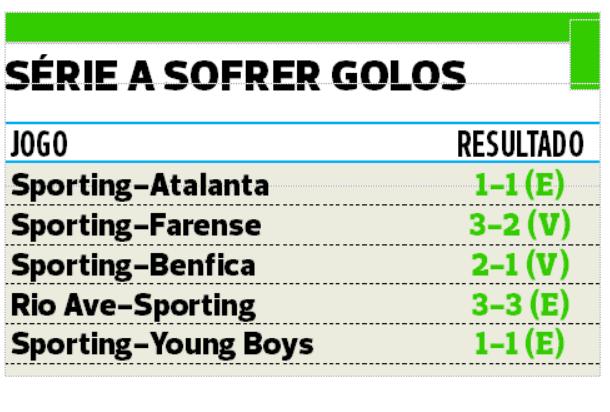 Os cinco jogos consecutivos a sofrer (Young Boys, Rio Ave, Benfica, Farense e Atalanta) igualaram o registo, por exemplo, também alcançado ainda esta época, entre setembro e outubro do ano passado, no qual os leões também sofreram em cinco jogos (Farense, Atalanta, Arouca, Olivais e Moscavide e Raków) com a curiosidade de ter sido diante de algumas das equipas que agora defronta, mas durante a primeira volta.