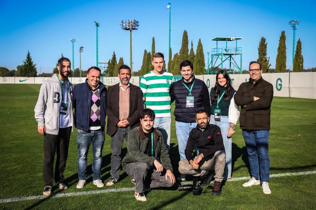 Da zona de imprensa do centro de treinos leonino até aos relvados da ala profissional são ainda umas centenas de metros, percorremos os corredores entre três relvados e ainda o sintético coberto. Na caminhada cruzamo-nos com as jogadores da equipa feminina. Bons dias, ainda que seja já início de tarde, trocados e o olhar curioso de jogadoras como Ana Borges ou Brenda Pérez para adivinhar o que aquela equipa estranha à Academia estará ali a fazer. E olhos naquela caixa que o Alexandre leva na mão.
