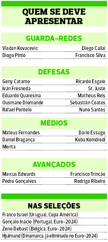 Caras novas espera-se apenas Kovacevic. Ausentes neste arranque os jogadores que estão, ou estiveram, ao serviços das seleções no Euro e na Copa América — além de Debast, Gonçalo Inácio (Portugal), Hjulmand (Dinamarca) e Israel (Uruguai). De estranhar não será também que Gyokeres tenha autorização para se apresentar alguns dias depois, porque a 28 de maio foi operado ao joelho esquerdo e começou as férias mais tarde, devido aos trabalhos de recuperação, que correm muito bem e que não o vão impedir de estar a 100 por cento no primeiro jogo oficial. E de estar muito comprometido com o emblema de Alvalade.