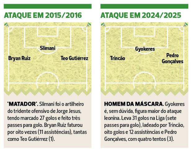 Olhando para o tridente ofensivo desta temporada, com Gyokeres à cabeça (ver campo), ladeado por Trincão e o agora reforço Pedro Gonçalves, regressado à competição após paragem de cinco meses por lesão — Conrad Harder e Geny Catamo levam cinco golos cada na Liga — Jefferson fez uma revelação: «Adorava jogar com o Gyokeres. Comigo ali na esquerda ia ser feroz [risos].»