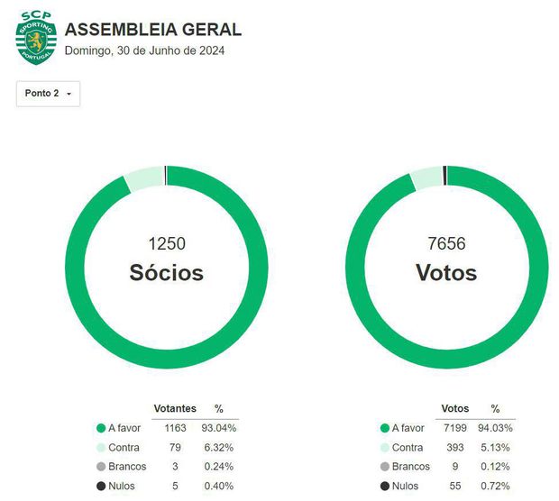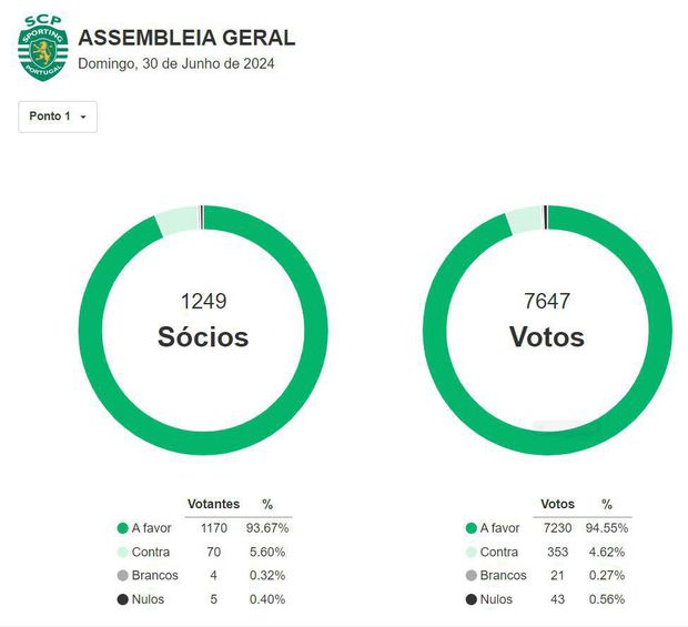 Realizou-se, este domingo, uma Assembleia Geral, no Pavilhão João Rocha, com dois pontos na ordem de trabalhos: a apreciação e votação do orçamento do clube – rendimentos, gastos e investimentos – para 2024/2025) e as contas consolidadas do Grupo Sporting, referentes a 2022/2023, sendo que o primeiro ponto foi aprovado com 94,55% dos votos, e o segundo com 94,3%, sendo que estiveram presentes 1252 sócios.