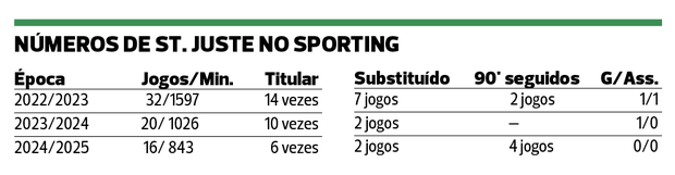 Ruben Amorim, que sempre defendeu o central com unhas e dentes, elogiando as suas caraterísticas e a mais-valia que era para o plantel, quando questionado sobre a condição física do jogador, teve de fazer uma gestão com pinças. Olhando para os números de St. Juste, salta à vista o facto de o defesa ter dificuldades em cumprir 90 minutos continuamente.