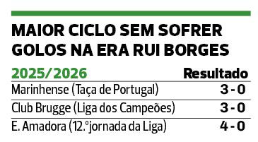 No último domingo, em Alvalade, na receção ao E. Amadora, adversário a quem o Sporting aplicou chapa quatro, a equipa de Rui Borges alcançou o maior ciclo sem sofrer golos desde que o treinador de Mirandela assumiu o comando da equipa — o melhor registo foi conseguido na última época, ainda sob a batuta de Ruben Amorim, com a baliza invicta em cinco jogos consecutivos, mais concretamente em quatro jogos da Liga e um da Champions. Diga-se que, nesta equação, entram todas as competições e em que os leões estão envolvidos que, no caso são três: Marinhense, para a Taça de Portugal, Club Brugge, na Liga dos Campeões, e Estrela da Amadora, na Liga.