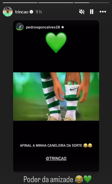 «Afinal a minha caneleira dá sorte», comentou, com Trincão, que bisou na vitória do Sporting diante dos gilistas, a responder: «Poder da amizade.»