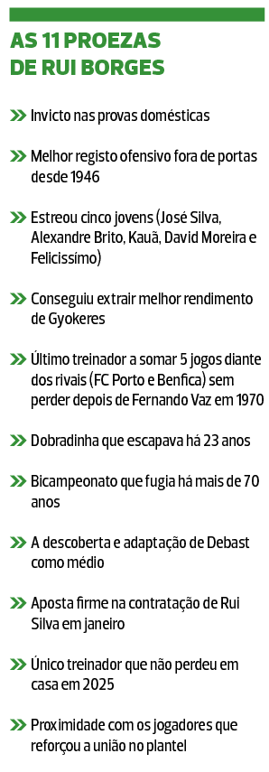Foi, por certo, uma das declarações mais marcantes de Rui Borges nestes 150 dias de leão ao peito. Recordemos: «Eu e a minha equipa técnica chegámos aqui pelo trabalho, pela resiliência. É uma equipa técnica desconhecida, não fui um grande jogador, não estudei, sou apenas o Rui Borges de Mirandela, comecei lá atrás... e isto é o culminar de um sonho.» Um desabafo durante os festejos de um bicampeonato que fugia há mais de 70 anos. Uma proeza que, diga-se em boa verdade, poucos acreditariam após a aposta num treinador inexperiente que apanhou um camião descontrolado a grande velocidade conduzido, na altura, por João Pereira.