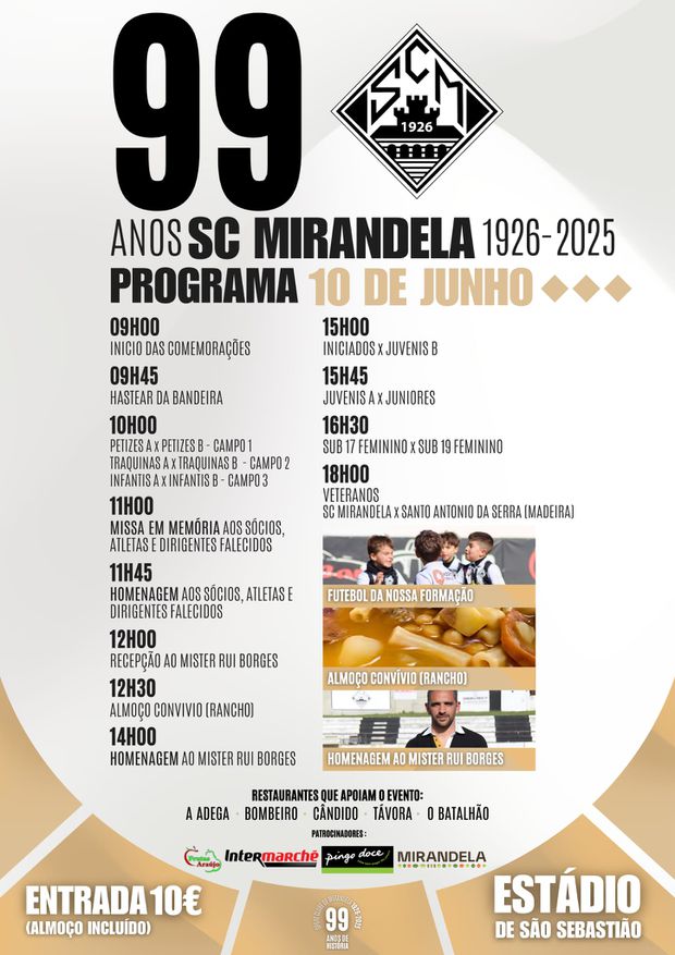 Rui Borges partiu ontem para férias nas quais irá tentar recarregar baterias para atacar o tricampeonato. Um período no qual não estará completamente desligado até porque, pelo meio, será alvo de (mais) uma homenagem no clube onde deu os primeiros passos como jogador e treinador: o Mirandela. O clube transmontano, na ocasião do 99.º aniversário, com um cartaz muito preenchido, irá prestar um tributo ao técnico leonino que marcará presença durante as cerimónias festivas. Uma enorme festa marcada para o próximo dia 10 de junho e que terá, claro está o treinador do Sporting como figura de cartaz e maior atração.
