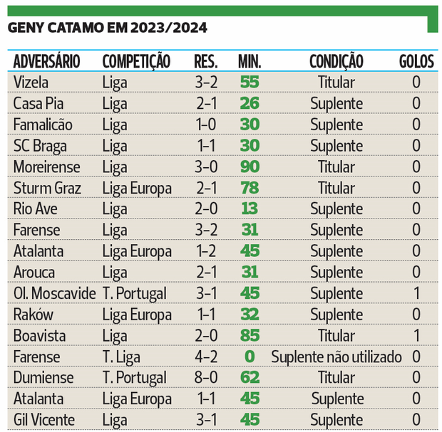 A época de Geny Catamo tem surpreendido. Começou como titular na 1.ª jornada, na receção ao Vizela, e de lá para cá participou num total de 17 jogos, marcou dois golos (Olivais e Moscavide e Boavista) e fez duas assistências (Moreirense e Olivais e Moscavide). Foi cinco vezes escolha inicial de Rúben Amorim e só por uma vez não saiu do banco de suplentes, com o Farense na Taça da Liga. Somou já 668 minutos de leão ao peito em 2023/2024.