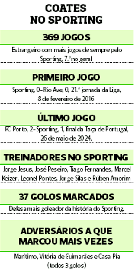Foram 3444 dias de leão ao peito, desde o início do empréstimo do Sunderland ao Sporting, a 31 de janeiro de 2016, até ontem, 6 de junho de 2024, altura em que Coates, Sporting e Nacional anunciaram a transferência do central de 33 anos para o clube onde se formou no Uruguai. Oito épocas e meia depois e com oito títulos conquistados, o capitão deixa Alvalade e a principal razão para a saída está numa questão familiar, um problema de saúde de uma pessoa próxima que antecipa um novo rumo na carreira. Outras razões ajudaram também, do apelo ao coração à gestão física que o limitaria durante a época, mas a razão principal foi mesmo a família. A administração leonina compreendeu, a saída acontece sem encargos. O Sporting poupa na folha salarial.