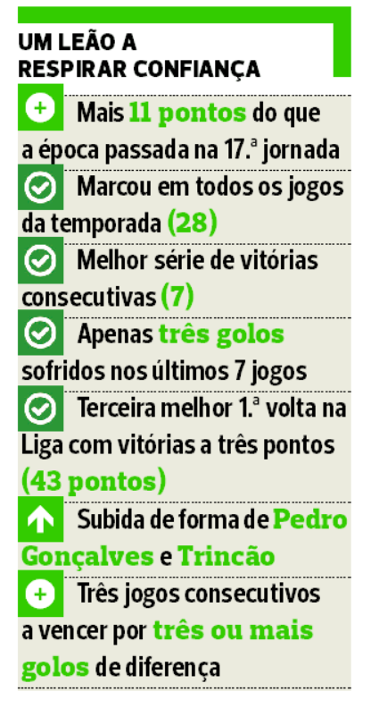 É sobre esta aura de otimismo que o Sporting terminou, após o 3-0 em Chaves, a primeira volta deste campeonato no topo da classificação. Que agarrou à passagem da 6.ª jornada. E que não mais largou. Com um discurso mais exigente, apelando à crença dos seus jogadores após o fraco rendimento da época passada, Rúben Amorim prepara-se para encarar esta segunda metade da Liga com uma pressão que, convém lembrar, a equipa soube lidar na última vez em dobrou no topo. Precisamente em 2020/2021 que terminou com o desejado título nacional.
