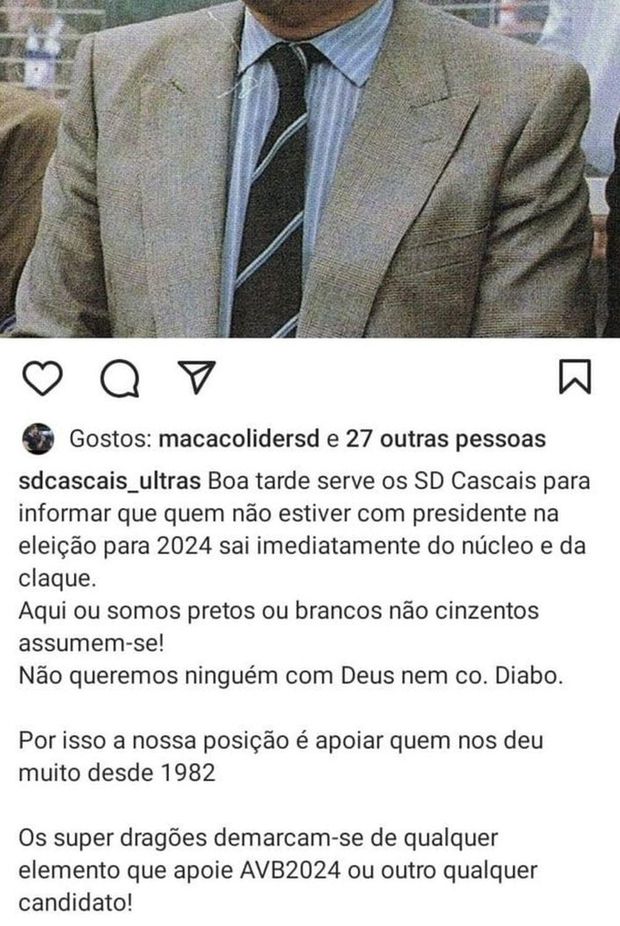 «Boa tarde! Serve os SD Cascais para informar que quem não estiver com o presidente na eleição para 2024 sai imediatamente do núcleo da claque. Aqui ou somos pretos ou brancos. Não cinzentos. Assumam-se», pode ler-se, na rede social Instagram, onde salta à vista um ‘gosto’ de Fernando Madureira, o líder da claque.