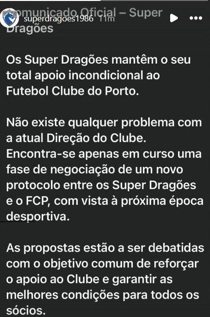 Em comunicado, os Super Dragões negam qualquer «problema com a atual direção do clube», esclarecendo que está em «curso uma fase de negociação de um novo protocolo» entre a claque e o FC Porto, «com vista à próxima época desportiva». «As propostas estão a ser debatidas com o objetivo comum de reforçar o apoio ao clube e garantir as melhores condições para todos os sócios» ligados aos Super Dragões.