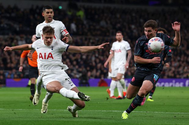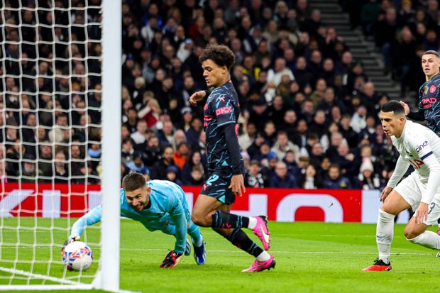 41' - Dose tripla de remates resulta em canto para o City. Primeiro Rodri, depois Kovacic e finalmente Bobb remataram na grande área do Tottenham, mas todos os remates foram desviados, o último deles para canto.