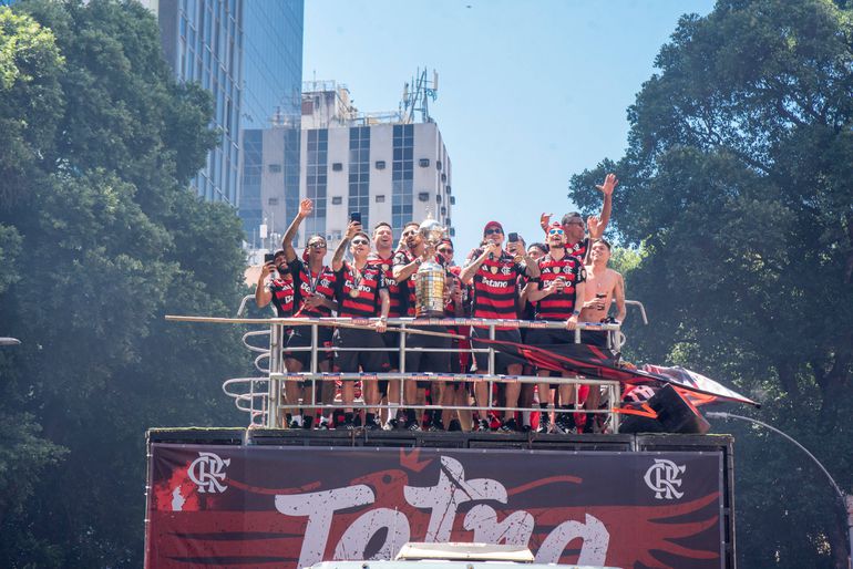 O plantel dos cariocas apresentou o troféu aos adeptos, com um remendo. O jogador cunhado na parte superior partiu-se durante os festejos em Lima, mas voltou a ser unido ao corpo da taça com fita adesiva. Já no Rio de Janeiro, Saul Ñiguez e Jorginho foram os líderes de um desfile pontuado por cânticos contra os rivais.