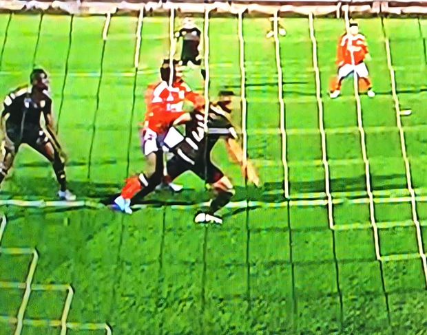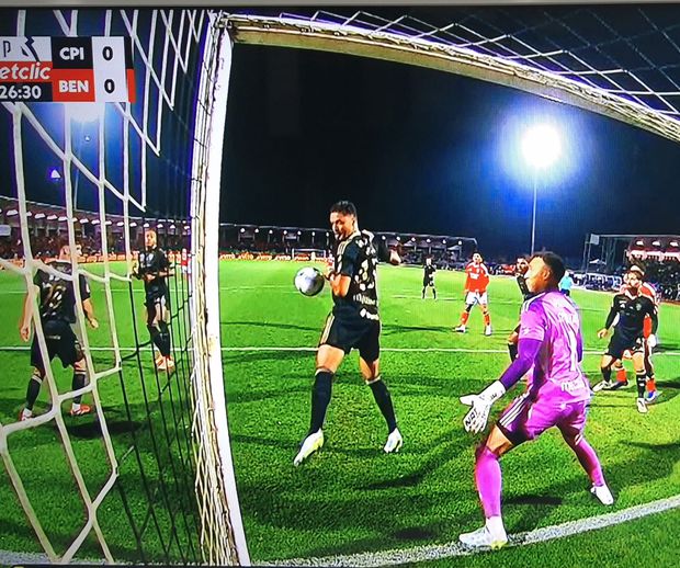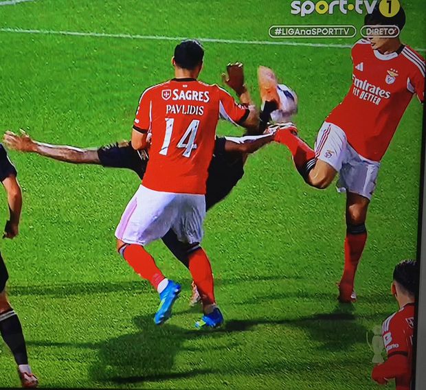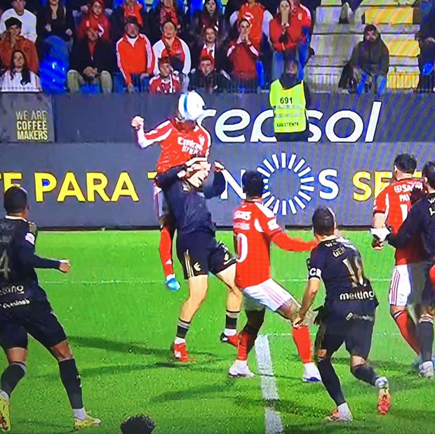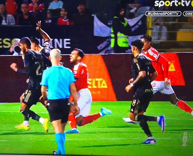 26. Quando dois jogadores levantam o pé na direção da bola, para a intercetar, tocar no esférico em primeiro lugar é sempre uma atenuante para que um eventual contacto subsequente não seja penalizado, foi o que aconteceu quando David Sousa com a ponta do seu pé esquerdo tocou na bola, chegando primeiro e antes do pé direito de Alexander Bah, sendo que a bola saiu pela linha de baliza. Bem o árbitro em não considerar qualquer infração e em assinalar o respetivo pontapé de canto.